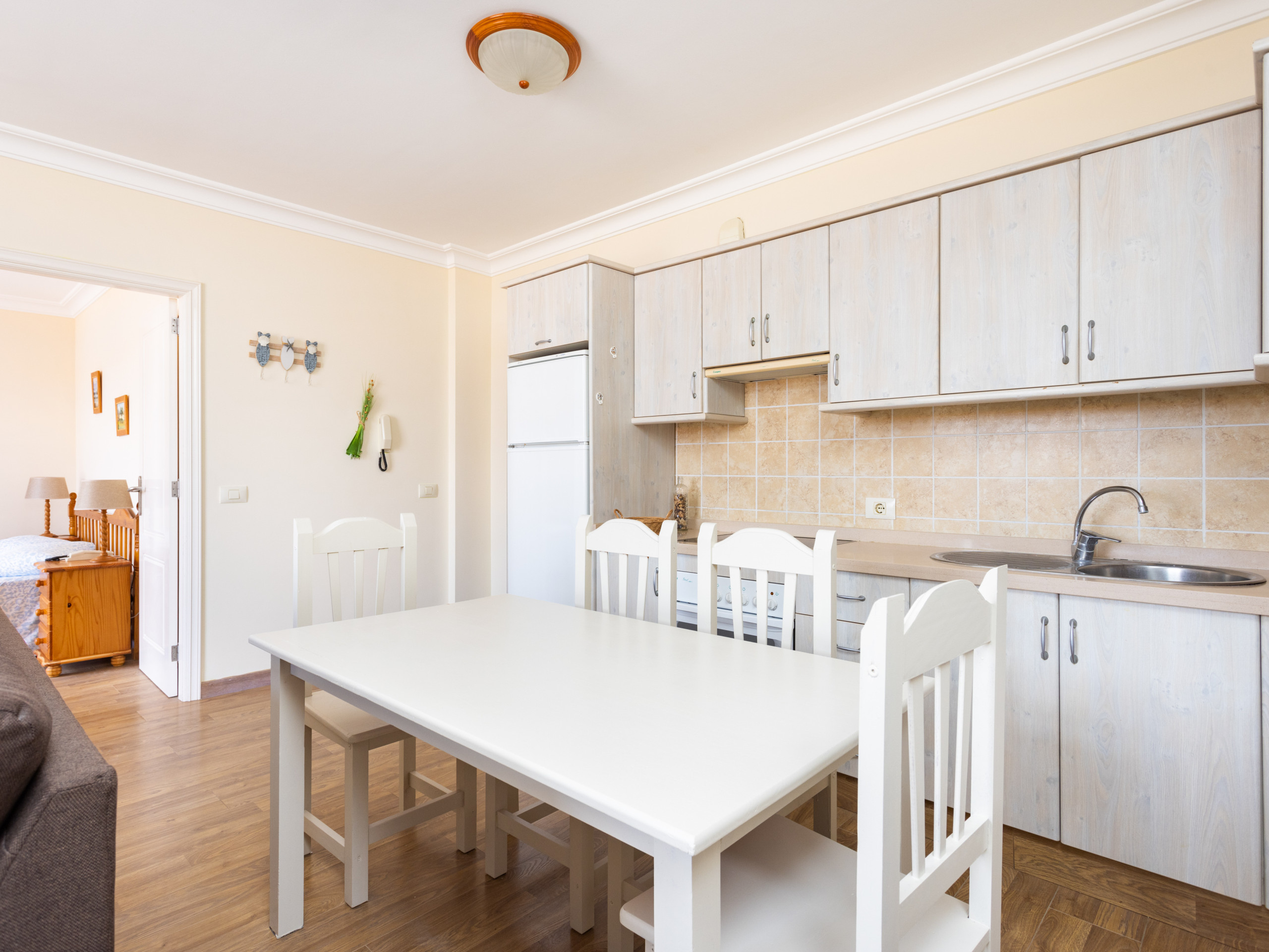 La cocina está completamente equipada con placas vitrocerámicas, frigorífico, congelador, horno, juguera y menaje completo. Además, cuenta con conexión WiFi para mantenerte conectado durante tu estancia. El apartamento tiene un único baño con ducha, perfecto para refrescarse después de un día de playa.