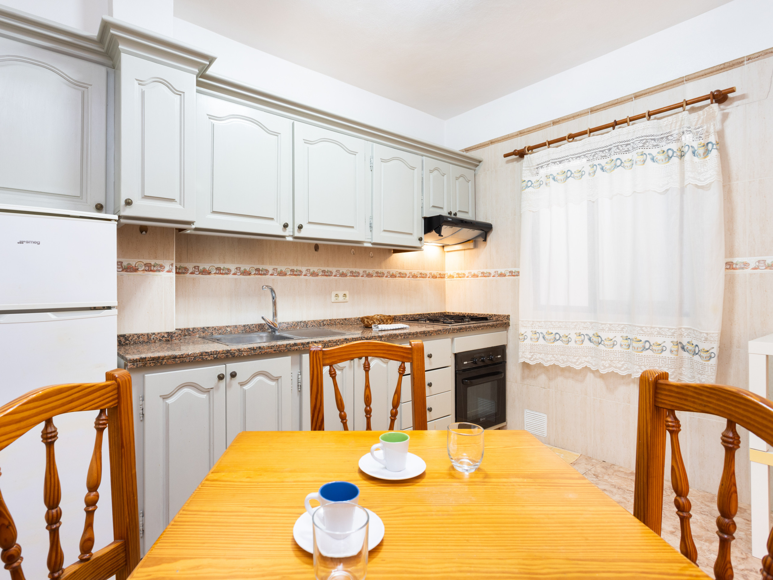 La cocina está completamente equipada con placas vitrocerámicas, frigorífico, congelador, horno, juguera y menaje completo. Además, cuenta con conexión WiFi para mantenerte conectado durante tu estancia. El apartamento tiene un único baño con ducha, perfecto para refrescarse después de un día de playa.