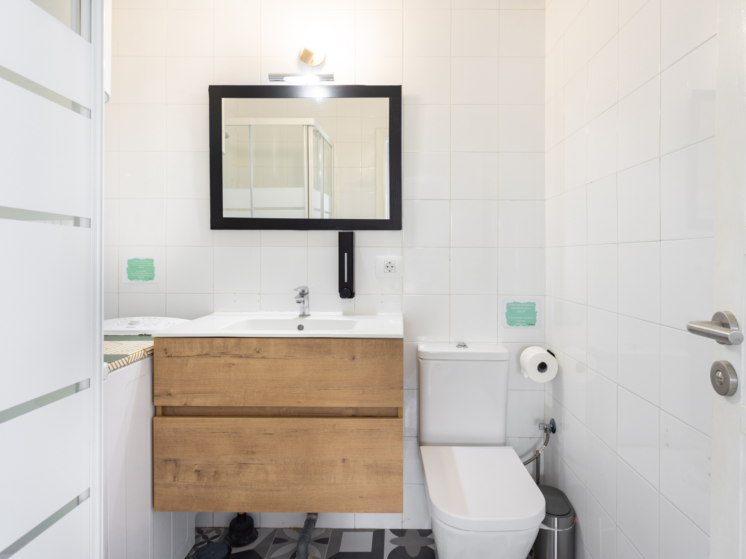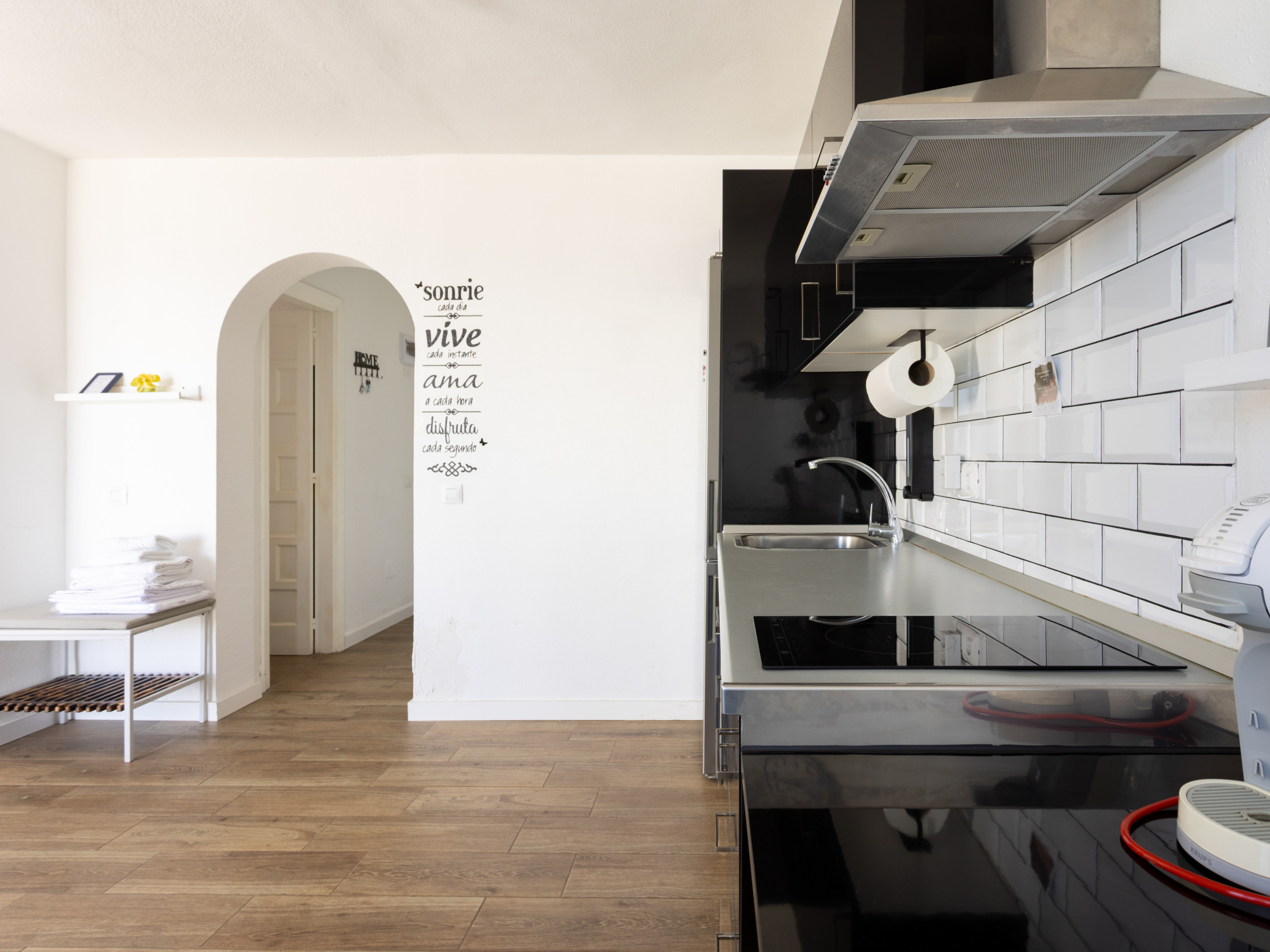El apartamento de 84 metros cuadrados está equipado con una cocina americana completamente funcional que incluye electrodomésticos de última generación como lavadora, horno, microondas, cafetera, tostadora y una amplia variedad de menaje. La zona de descanso incluye una cama queen size, una cama individual y una cama supletoria, garantizando opciones de dormitorio flexibles.