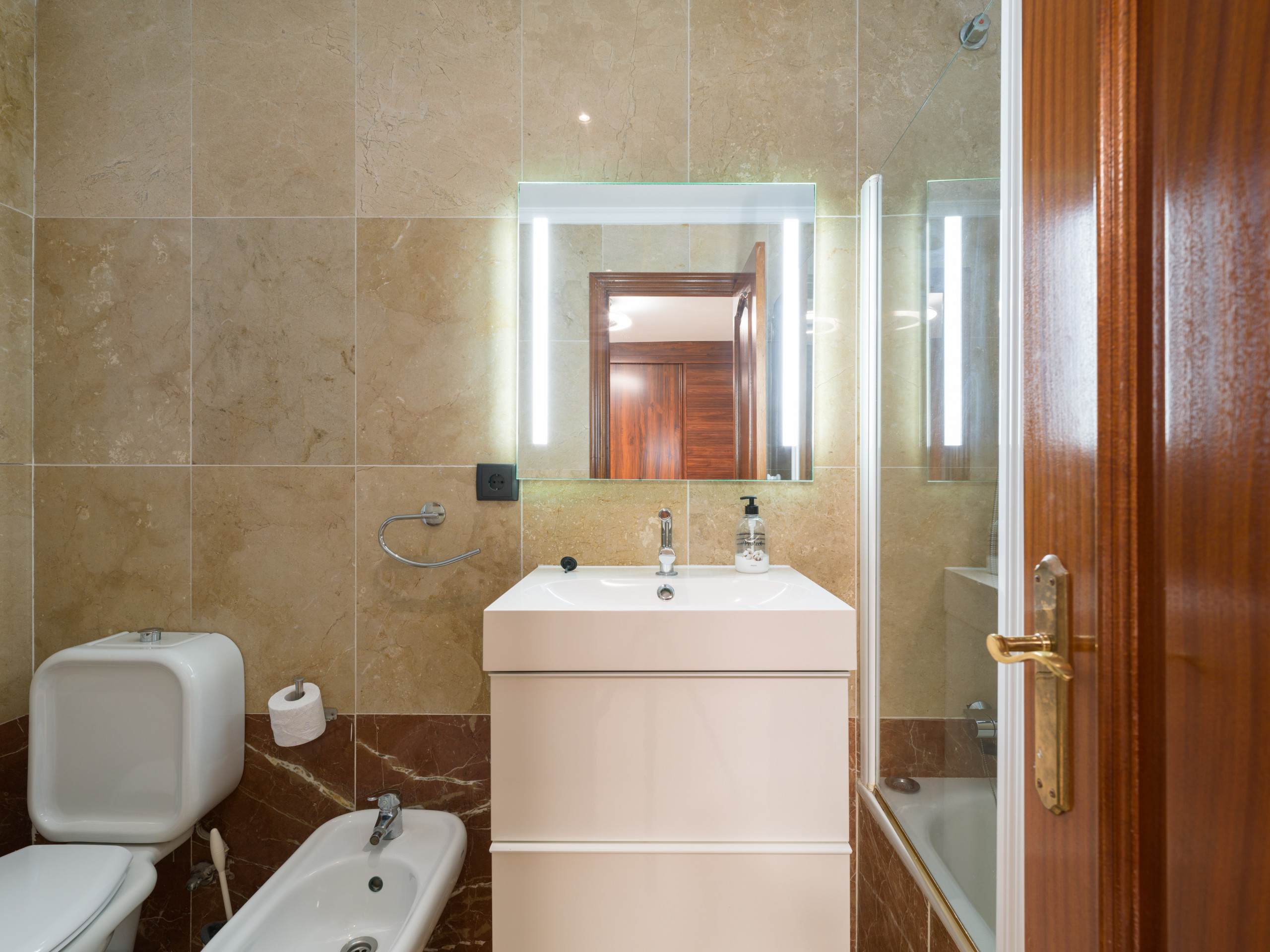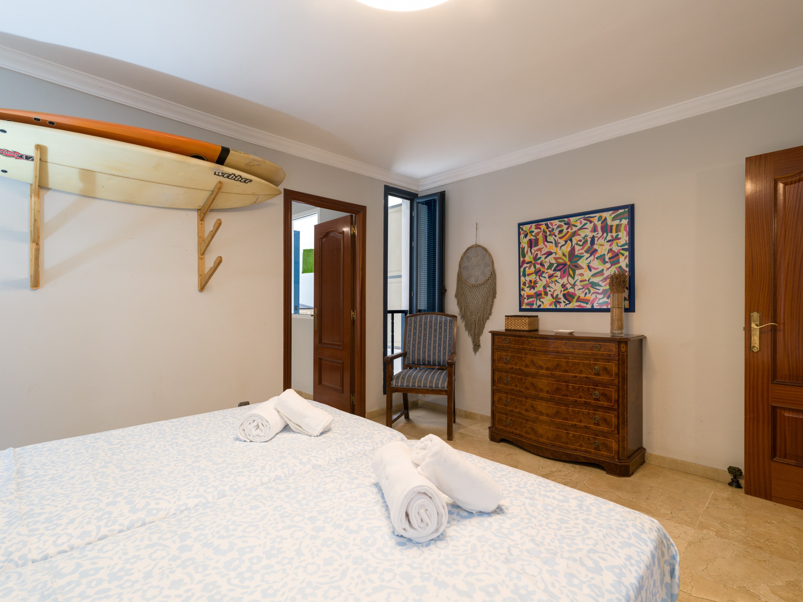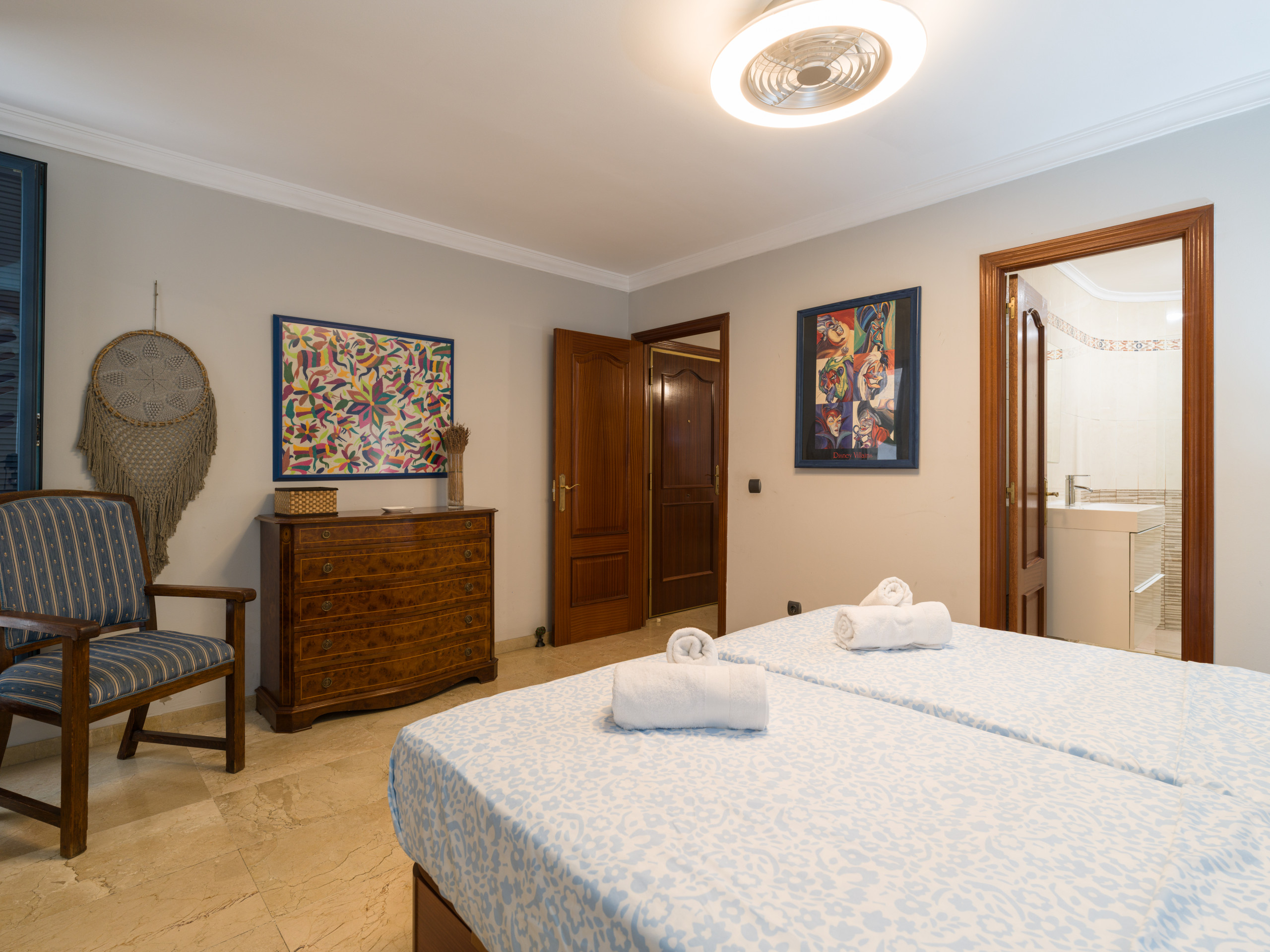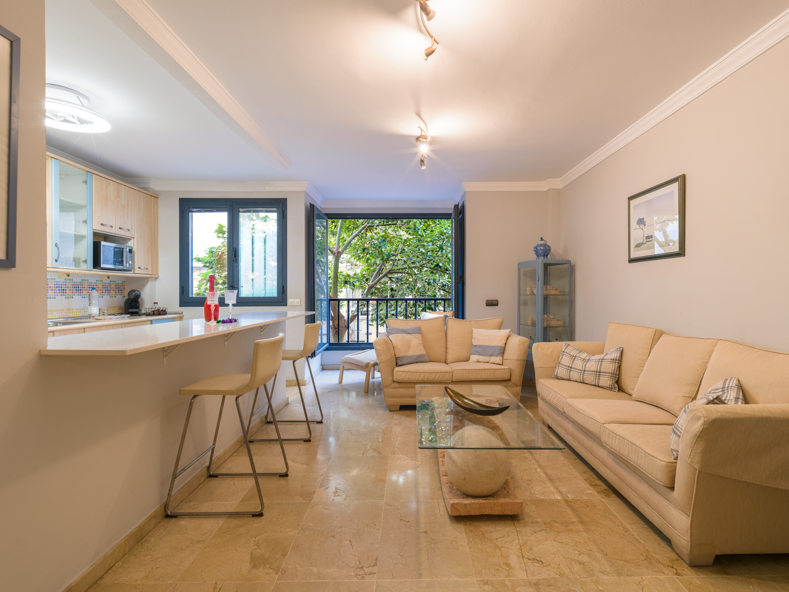 El apartamento cuenta con dos dormitorios equipados con dos camas dobles y un sofá-cama adicional, garantizando un descanso relajante para todos los huéspedes. Dos baños con ducha facilitan la convivencia y agiliza las rutinas matutinas.