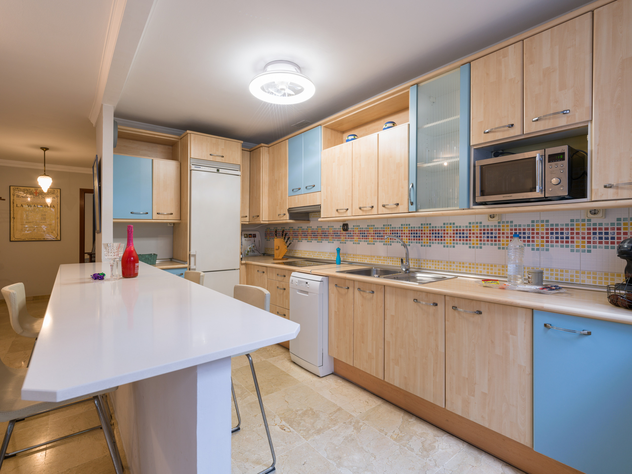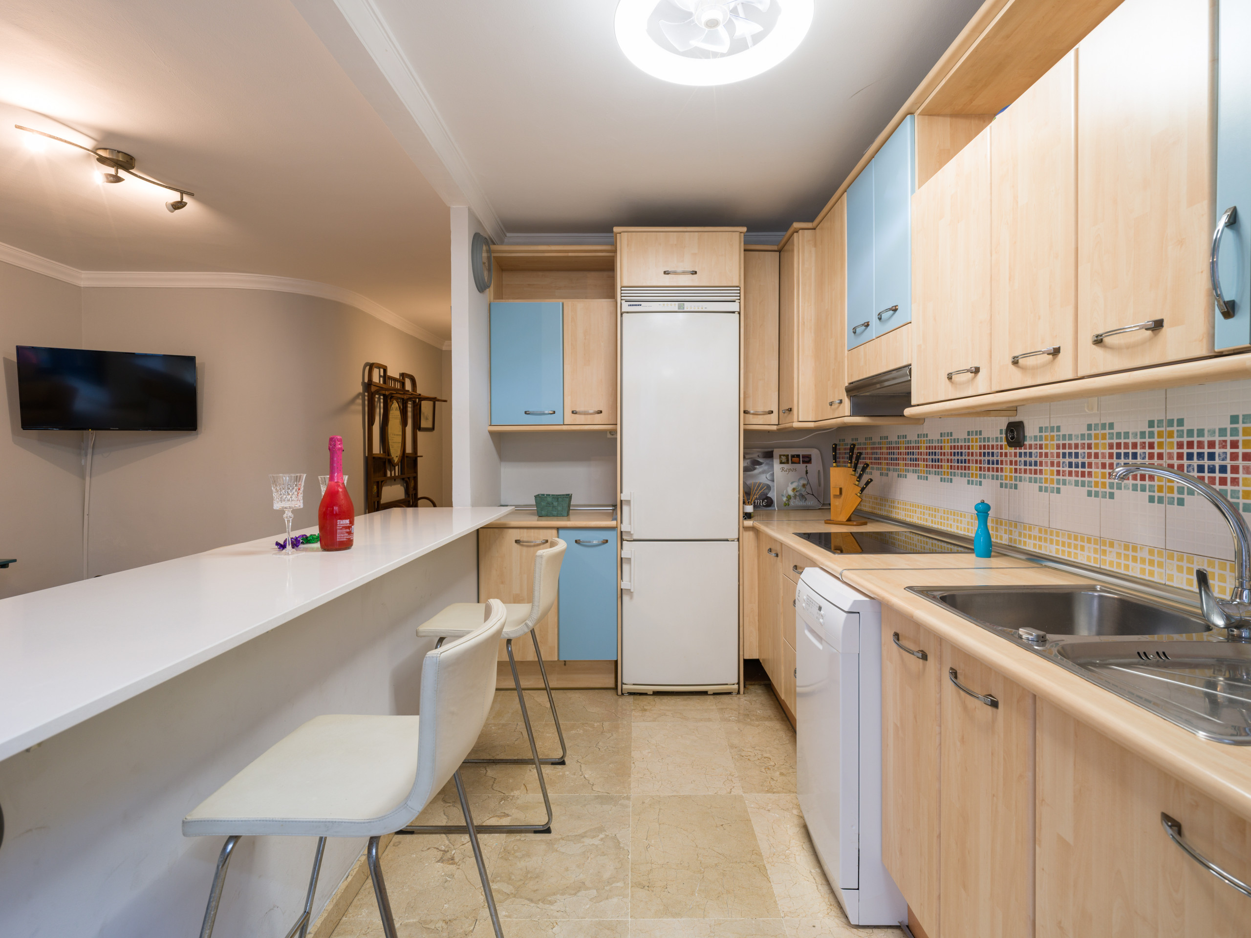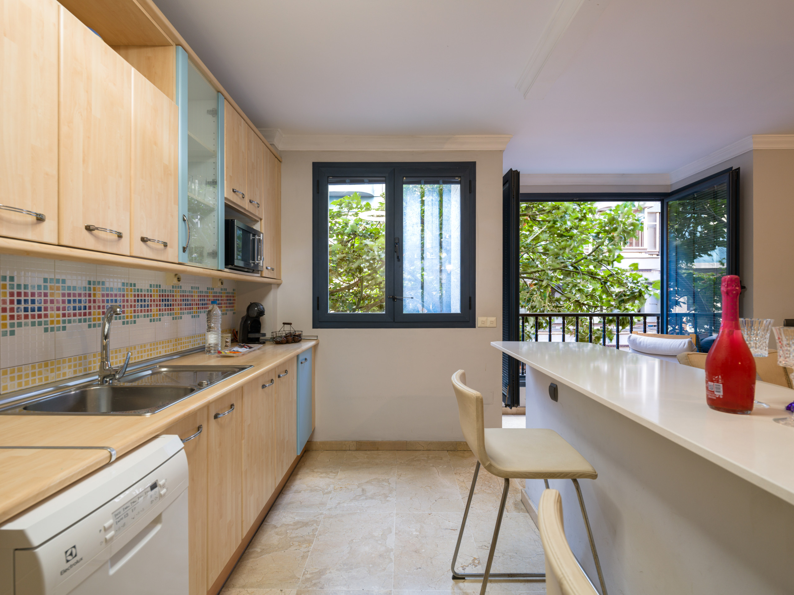 La cocina está completamente equipada con electrodomésticos modernos, incluyendo nevera, lavadora, lavavajillas, microondas, cafetera, tostadora, hervidor, exprimidor y menaje completo. Perfecta para preparar deliciosas comidas durante tu estancia.