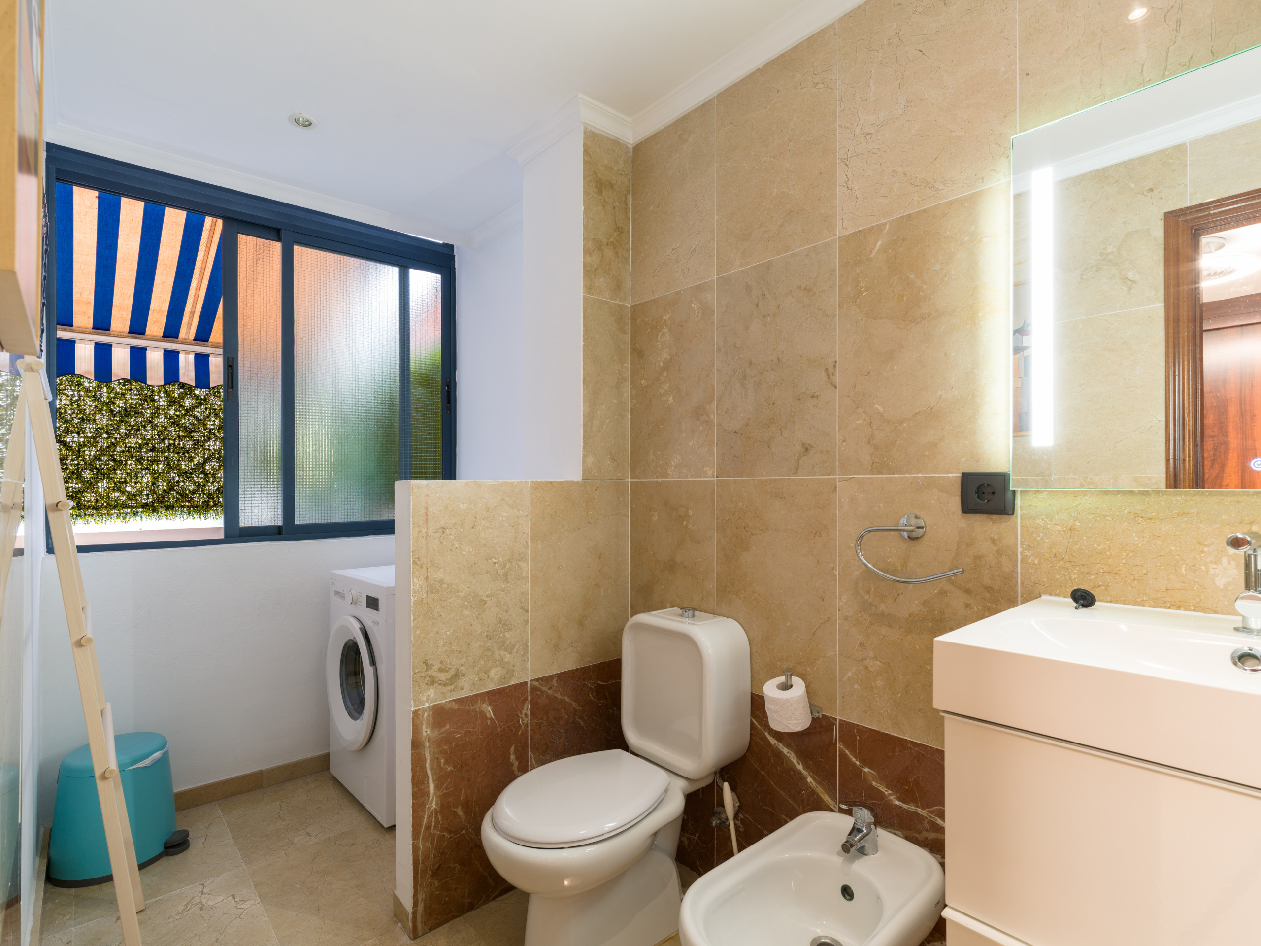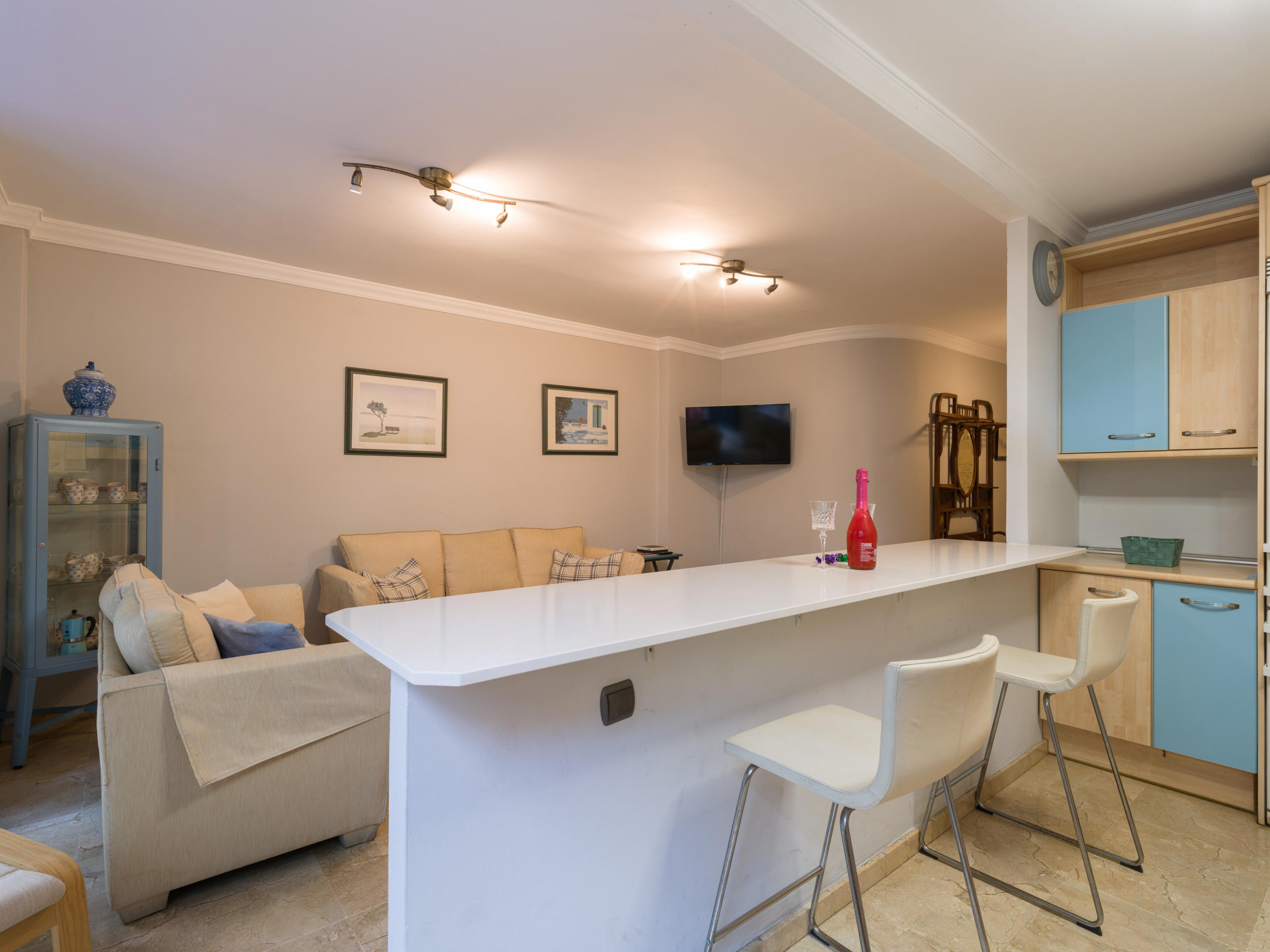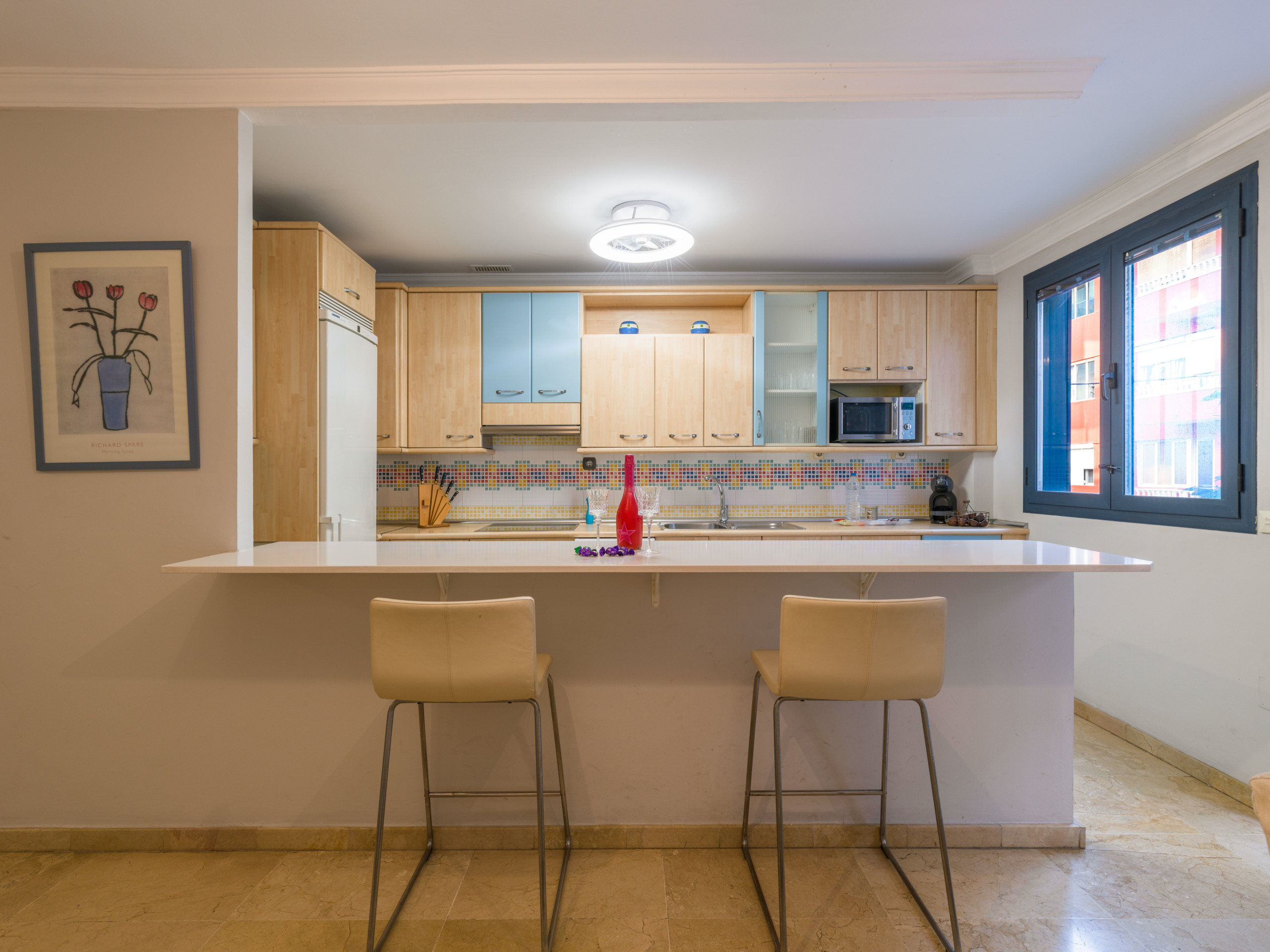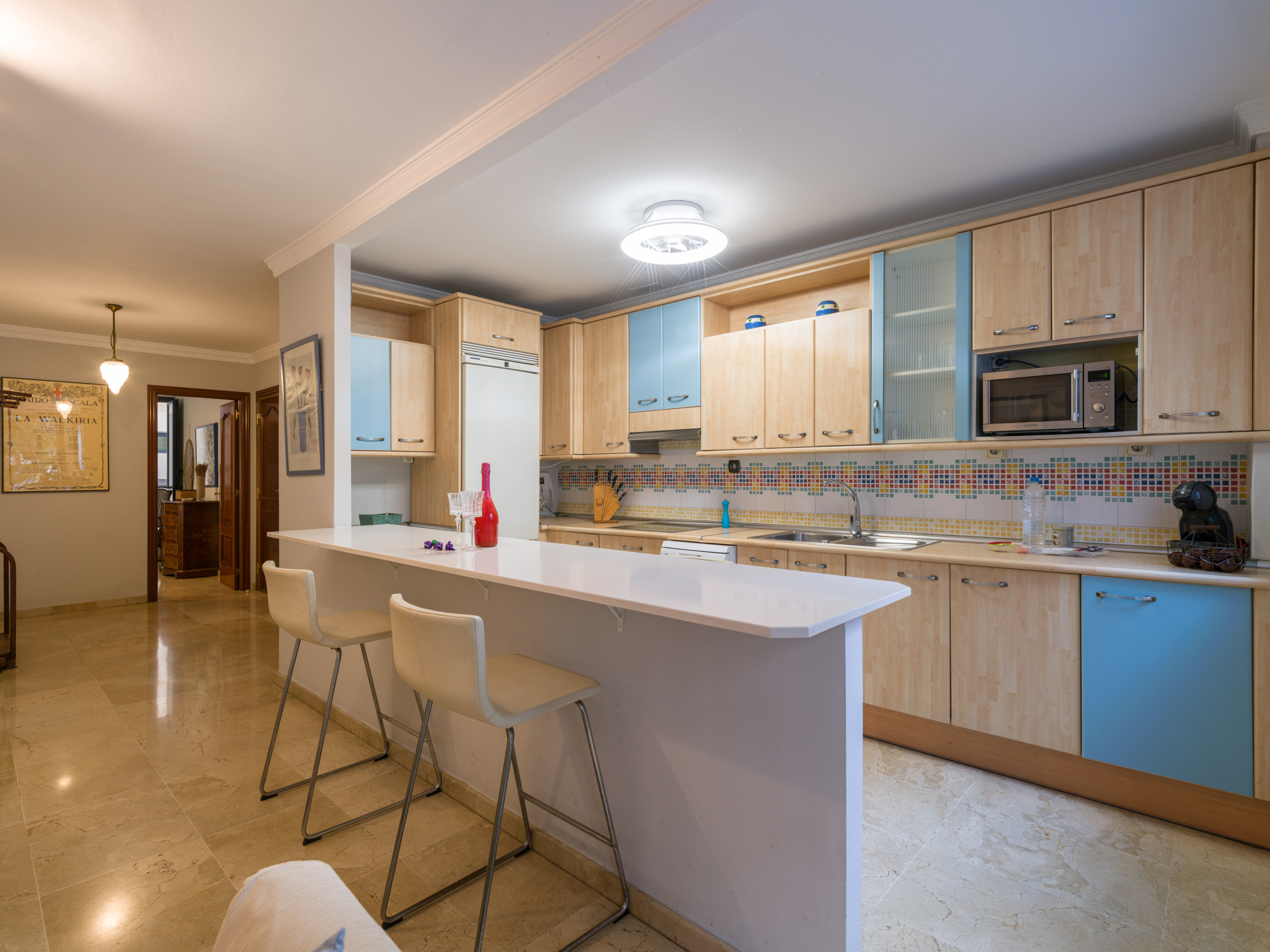 La cocina está completamente equipada con electrodomésticos modernos, incluyendo nevera, lavadora, lavavajillas, microondas, cafetera, tostadora, hervidor, exprimidor y menaje completo. Perfecta para preparar deliciosas comidas durante tu estancia.