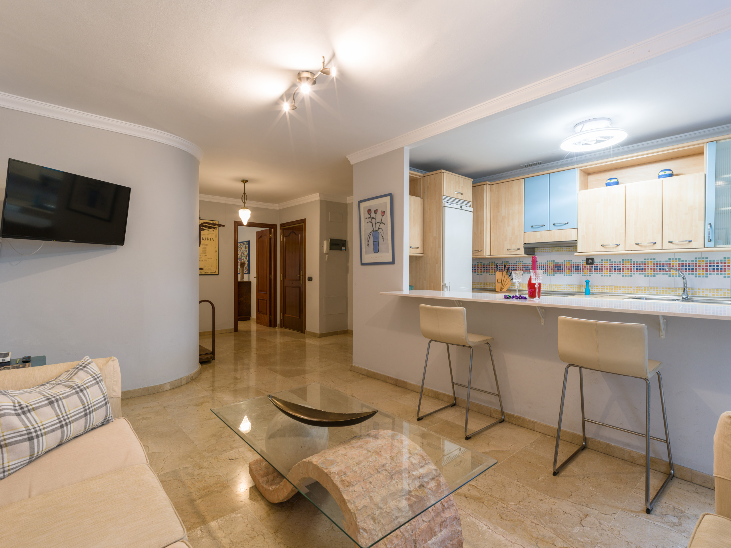 Tiene la cocina completamente equipada, que incluye fogón, menaje de cocina y una práctica tostadora. El piso cuenta con una amplia cama doble y un sofá cama adicional que permite alojar cómodamente a más huéspedes.
