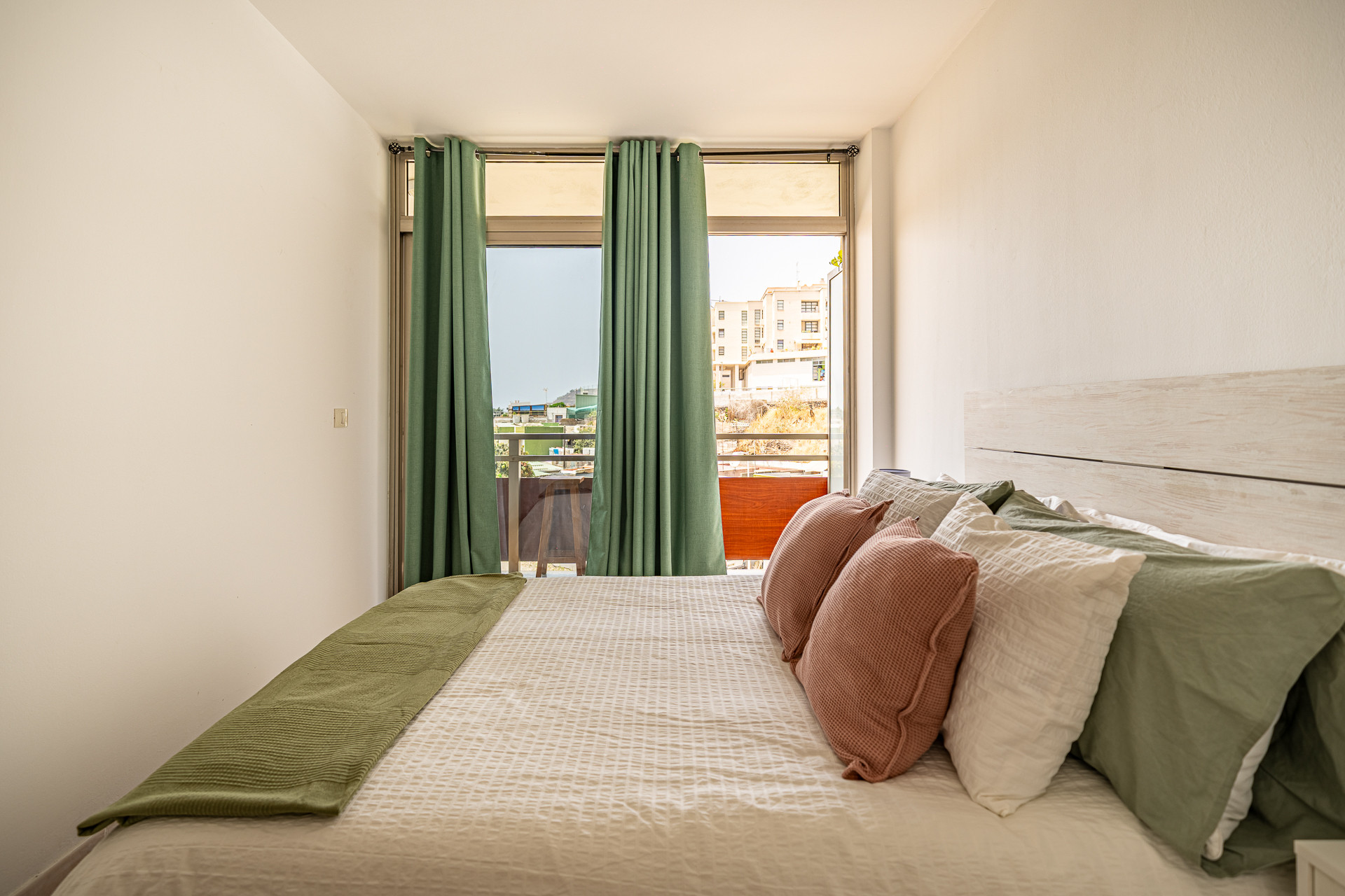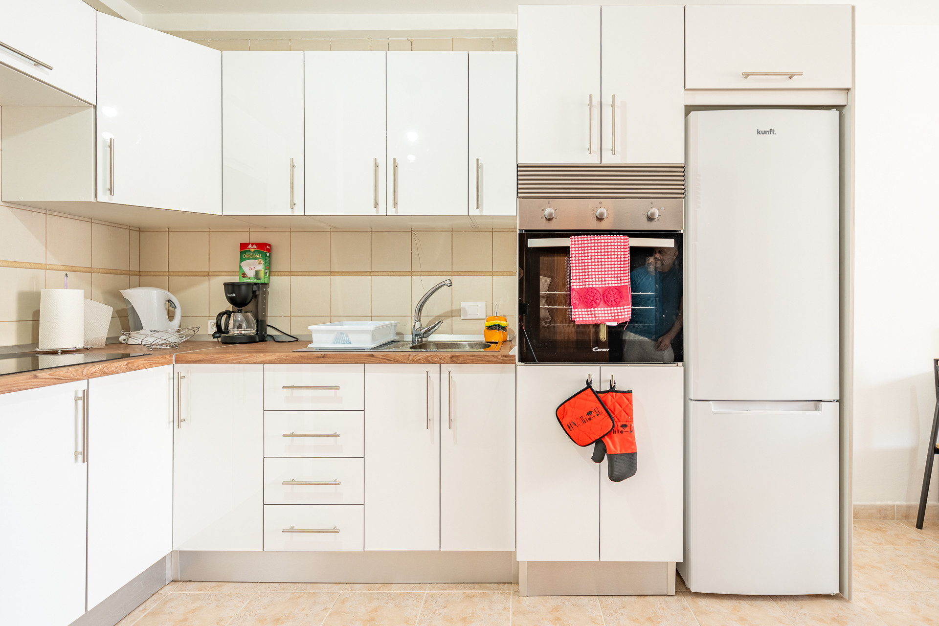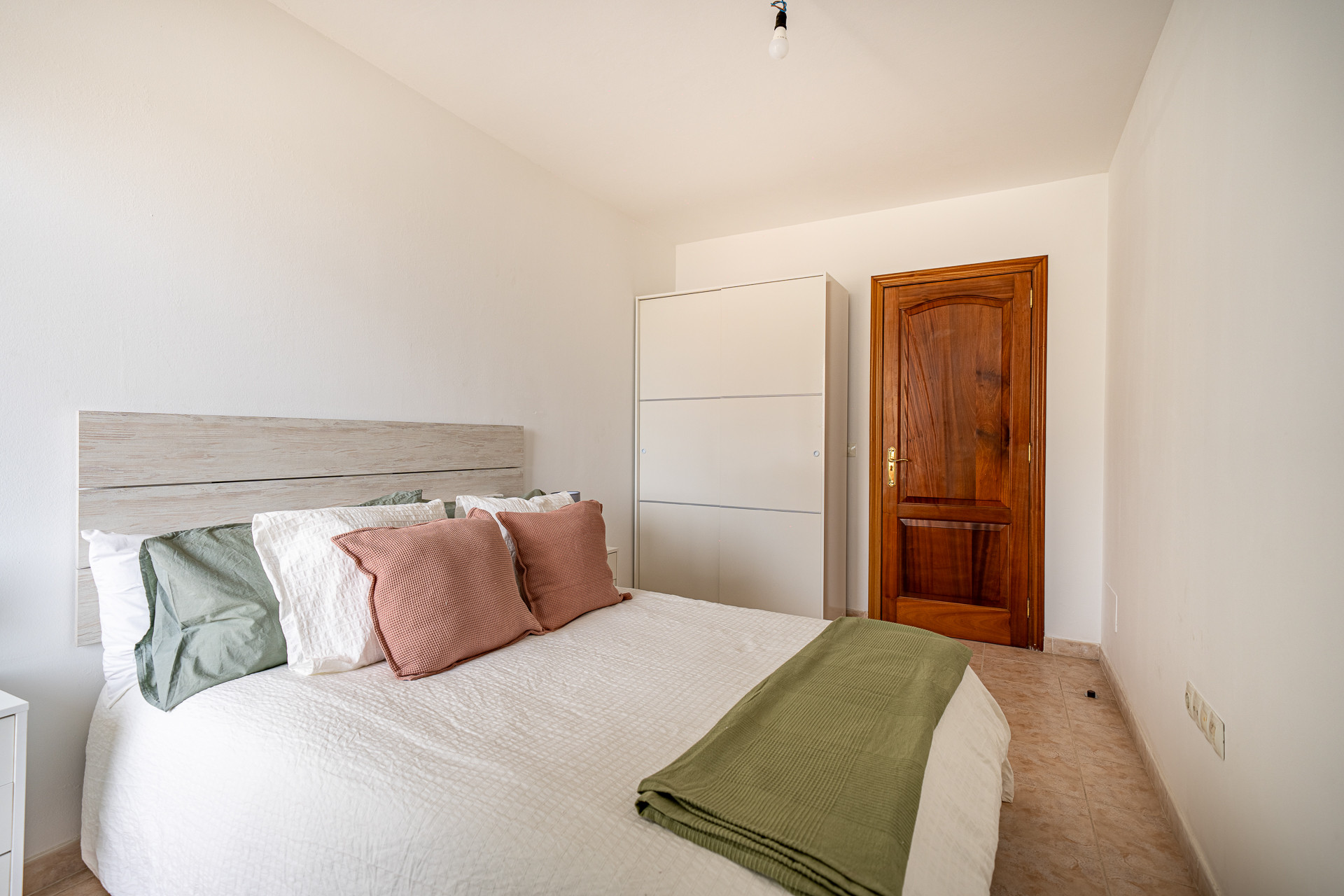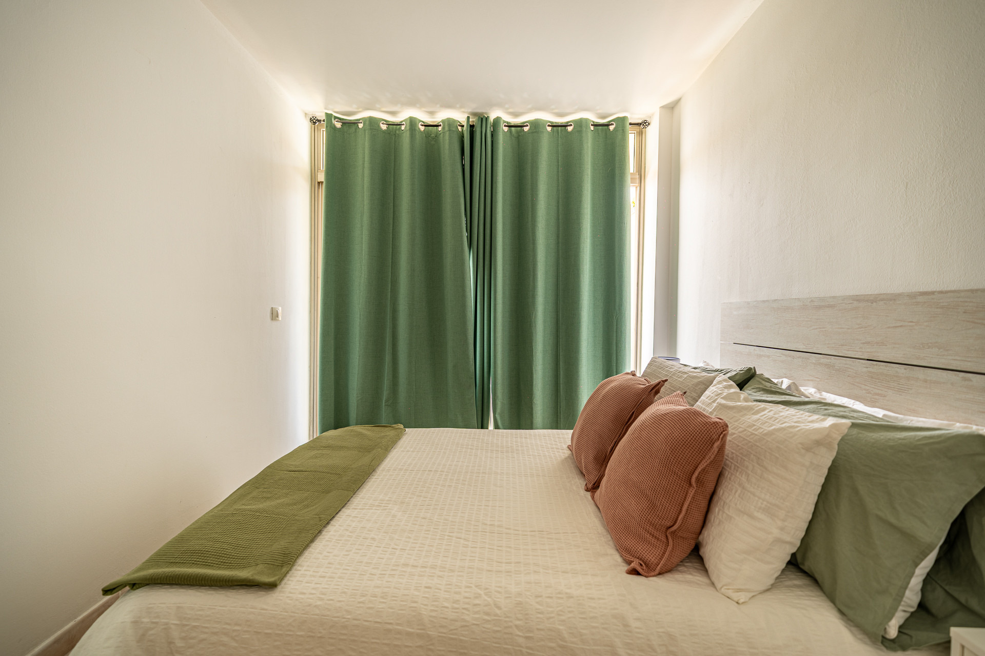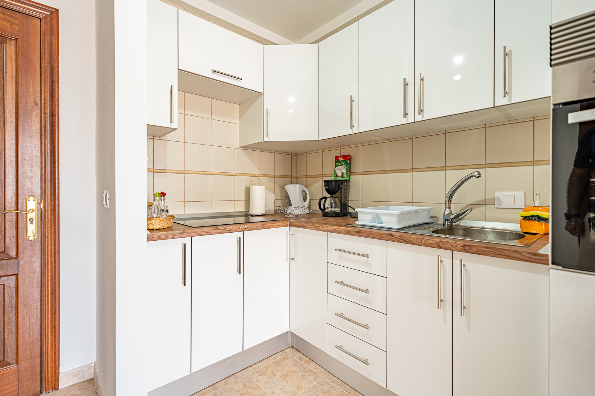 El apartamento cuenta con un dormitorio principal equipado con una cama doble, perfecto para parejas o viajeros solitarios. Dispone de un baño completo con ducha, ideal para relajarte después de un día de exploración. La cocina americana está totalmente equipada con electrodomésticos modernos como nevera, lavadora, horno, microondas, máquina de café y menaje completo, permitiéndote preparar deliciosas comidas durante tu estancia.