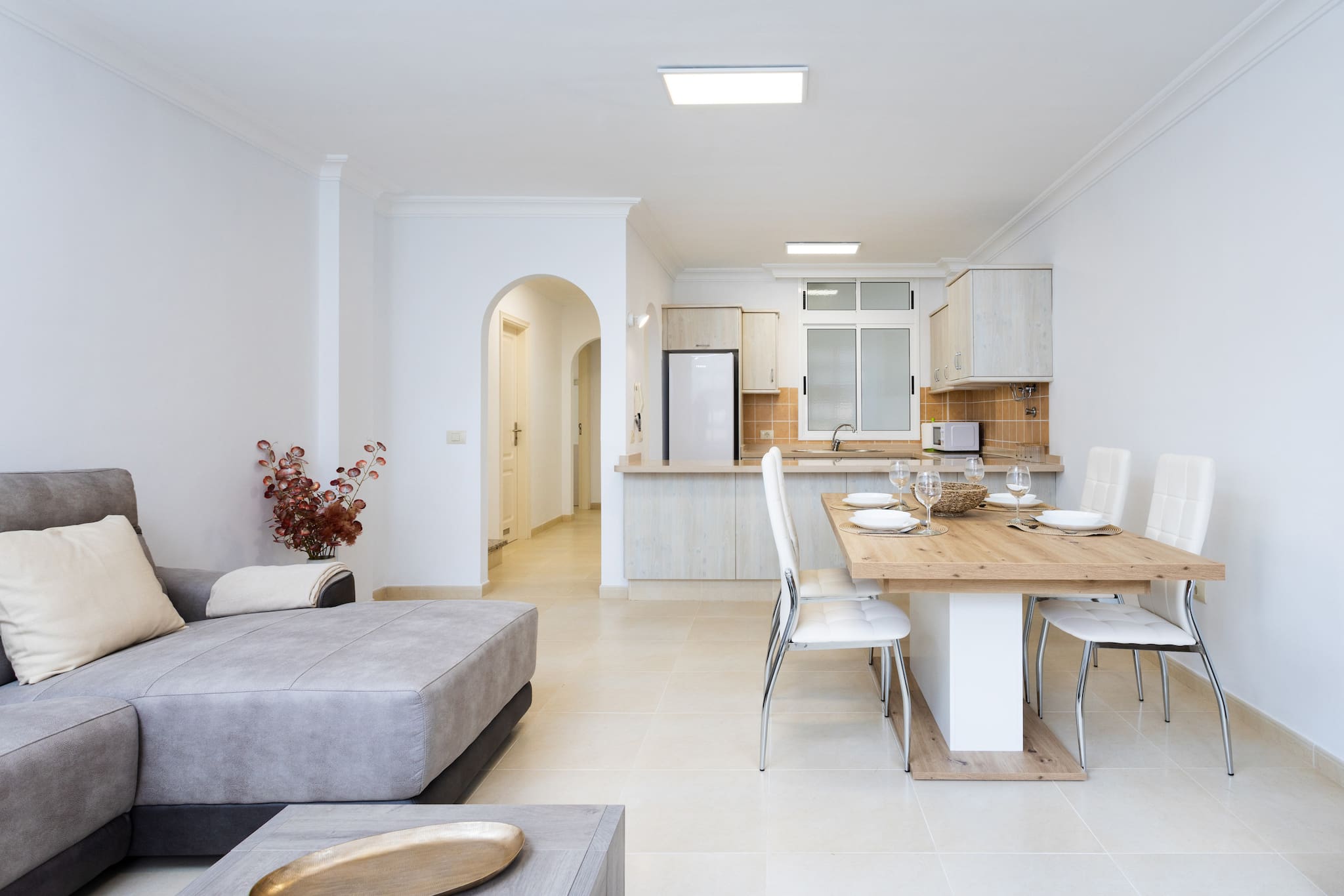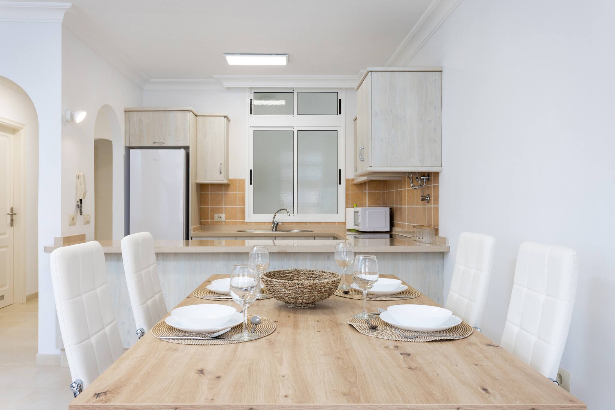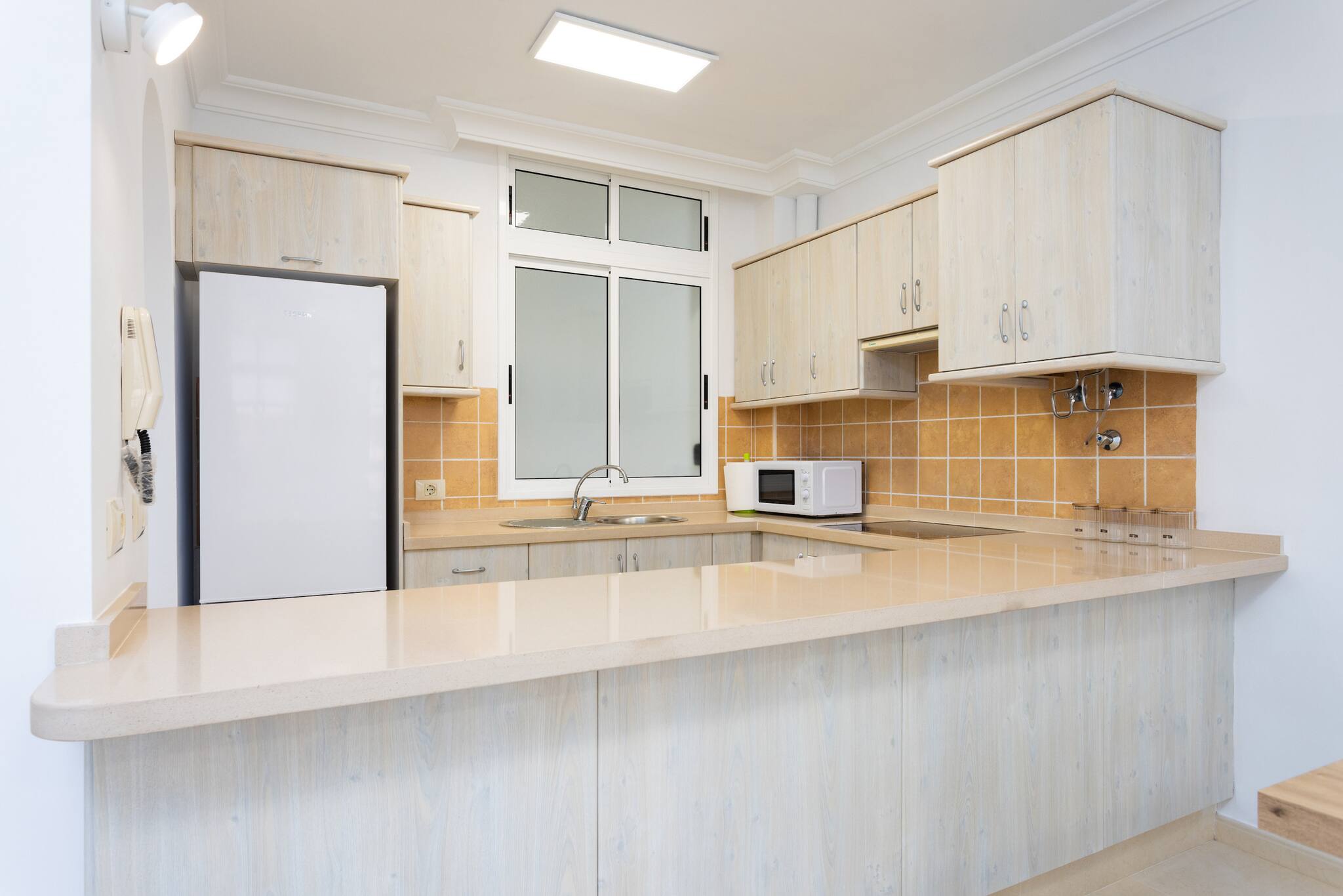 La cocina está completamente equipada con electrodomésticos modernos como nevera, lavadora, cafetera, horno, microondas, tostadora y hervidor. Ideal para preparar deliciosas comidas durante tu estancia.