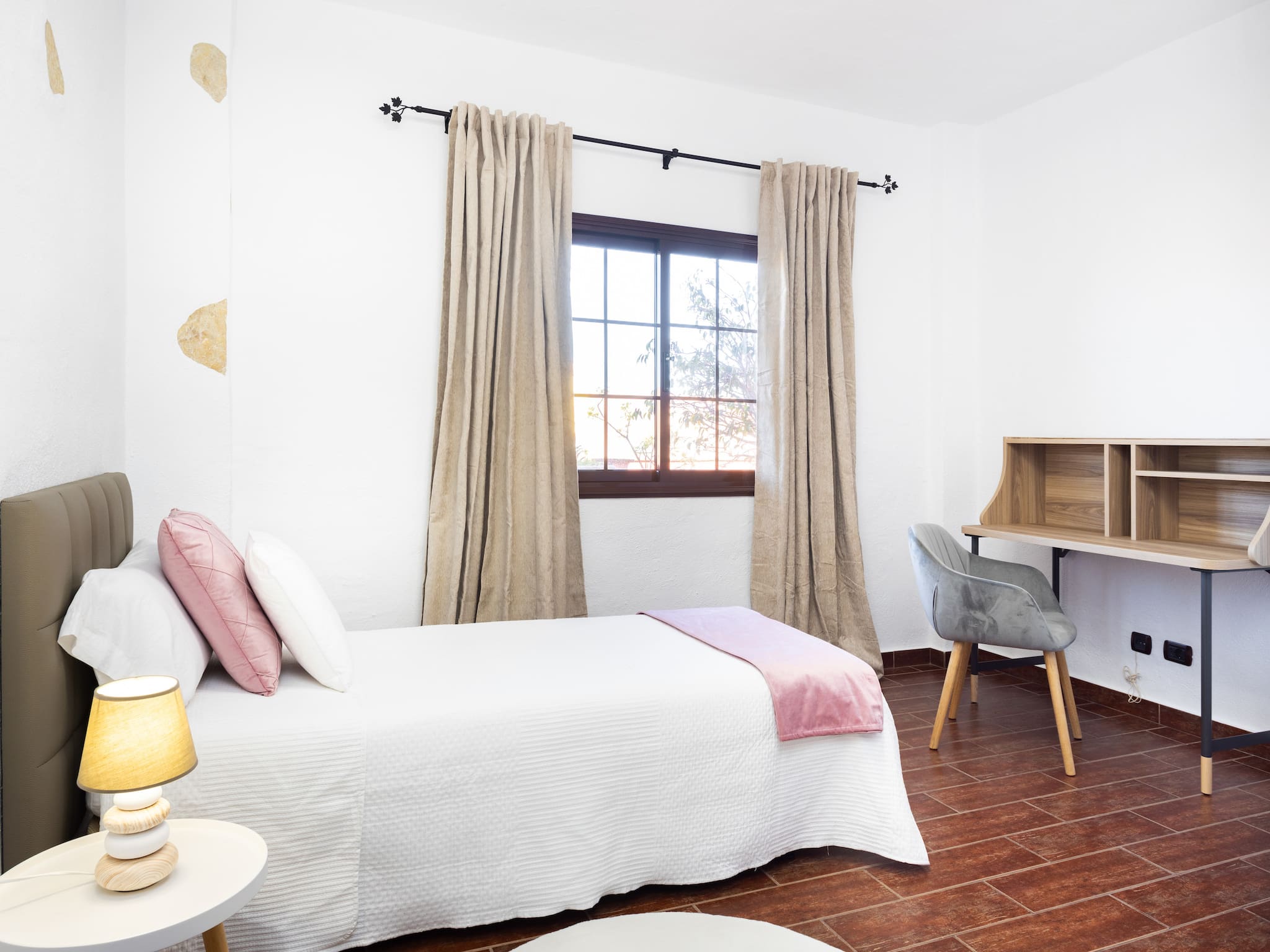 Acogedor apartamento, ideal para 4 personas, se encuentra pueblo de Santa Úrsula, al norte de la isla, de tenerife; con una amplia terraza desde la cual podrás disfrutar de impresionantes vistas al Teide y al mar. El apartamento dispone de tres dormitorios bien equipados: dos habitaciones con camas individuales y una con una cama de matrimonio. Cada dormitorio cuenta con ventilador, armario, escritorio y ropa de cama, garantizando una estancia cómoda y tranquila.