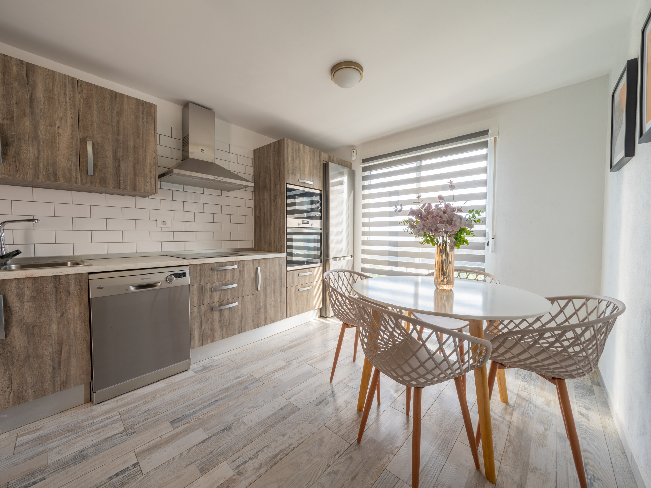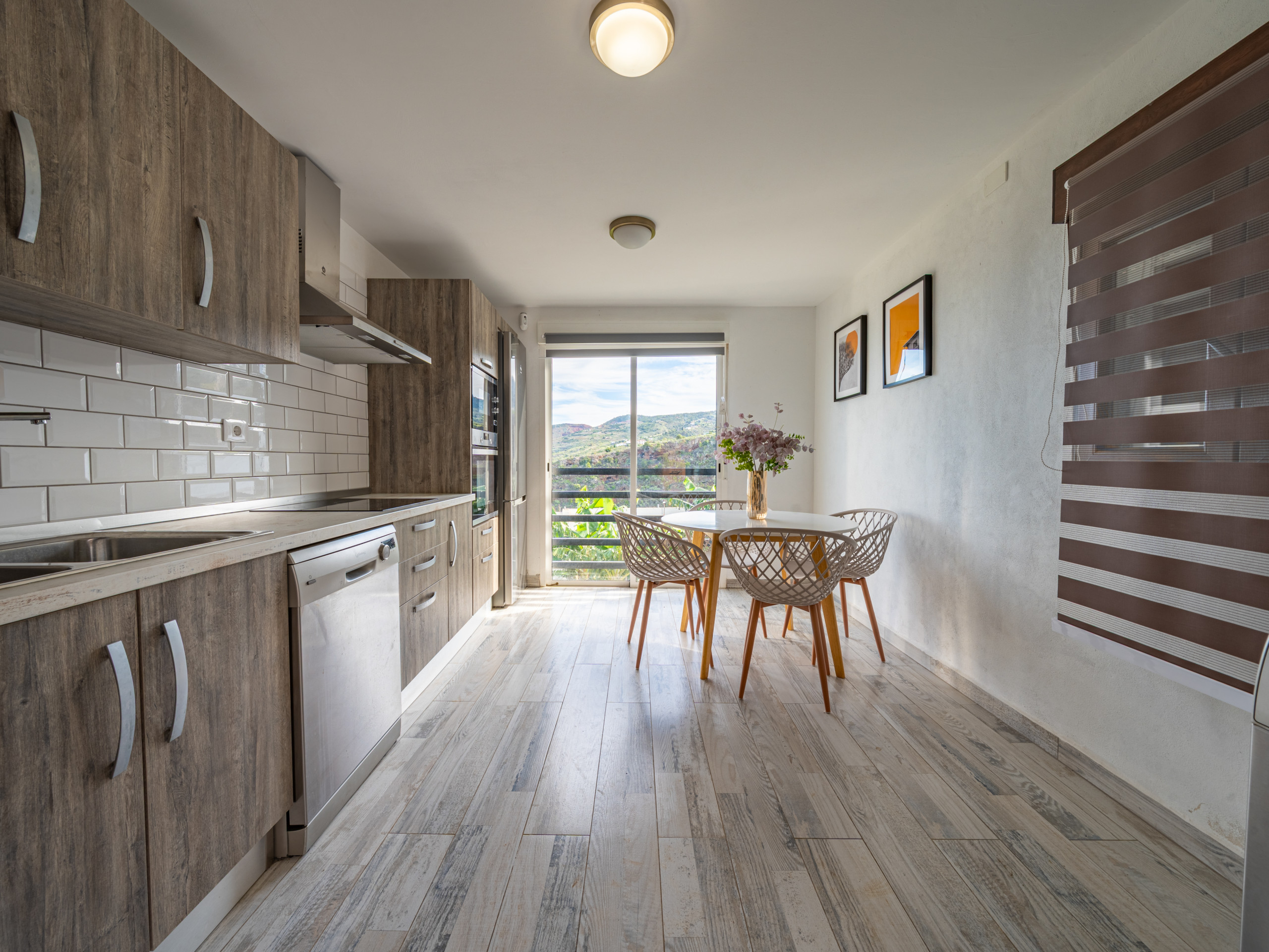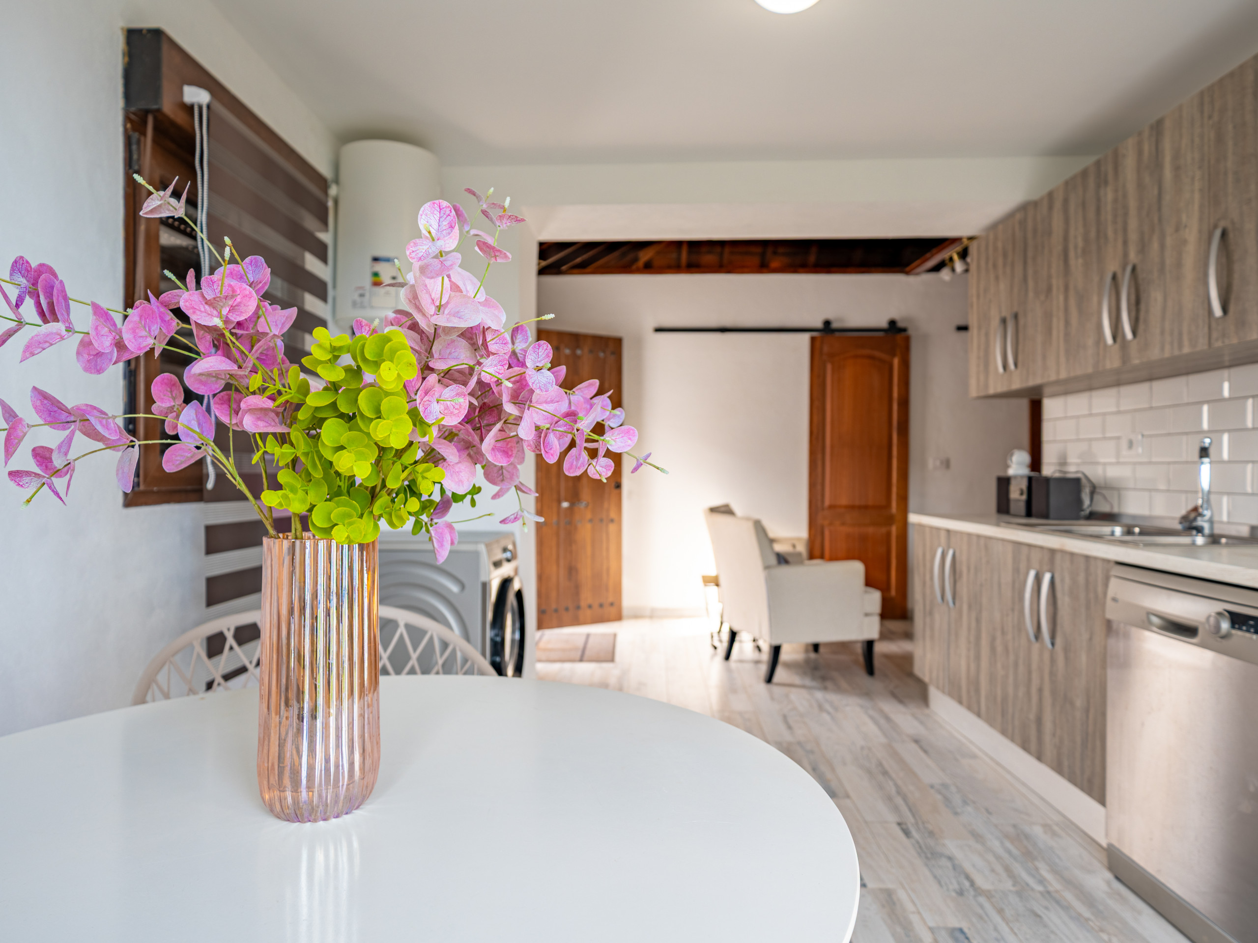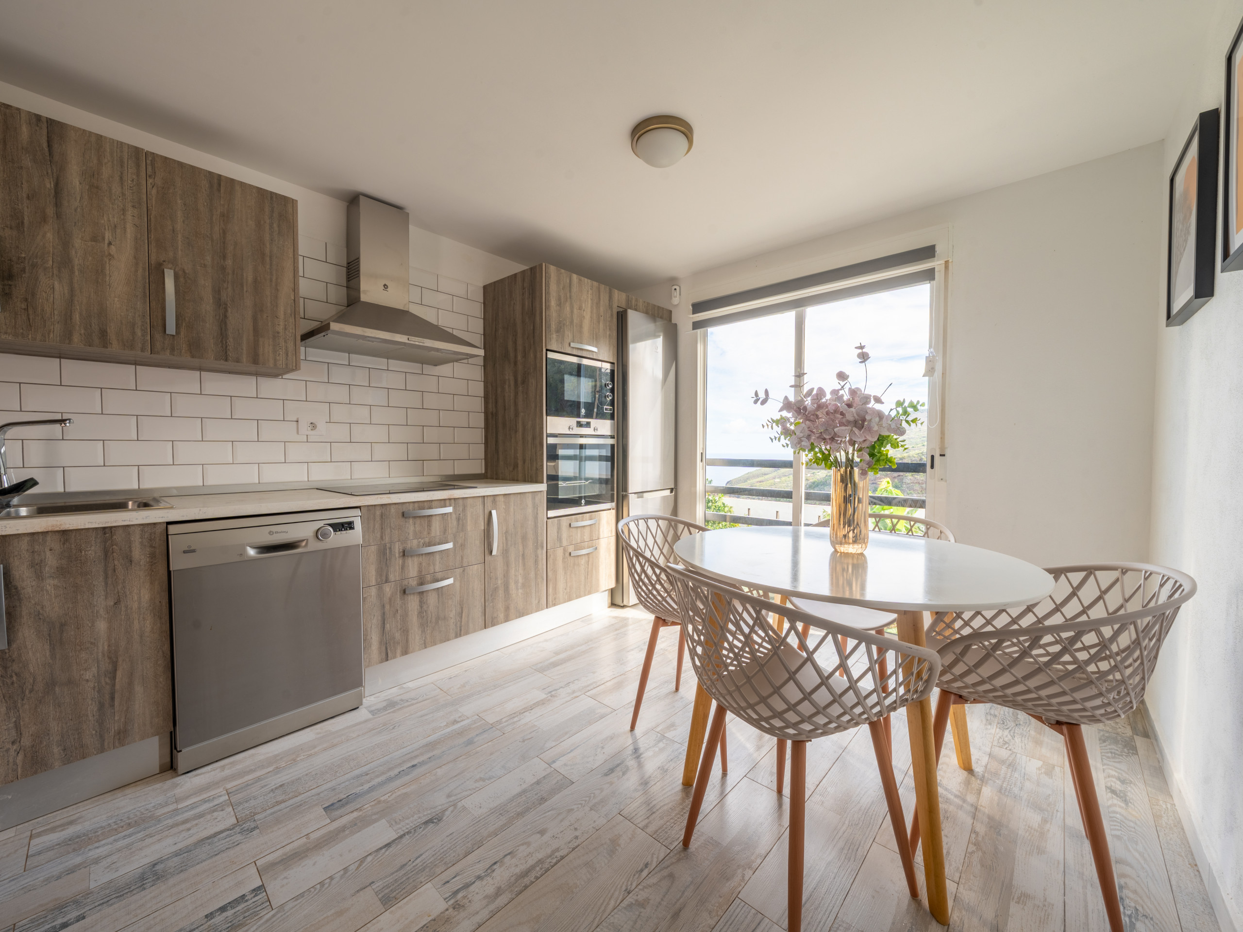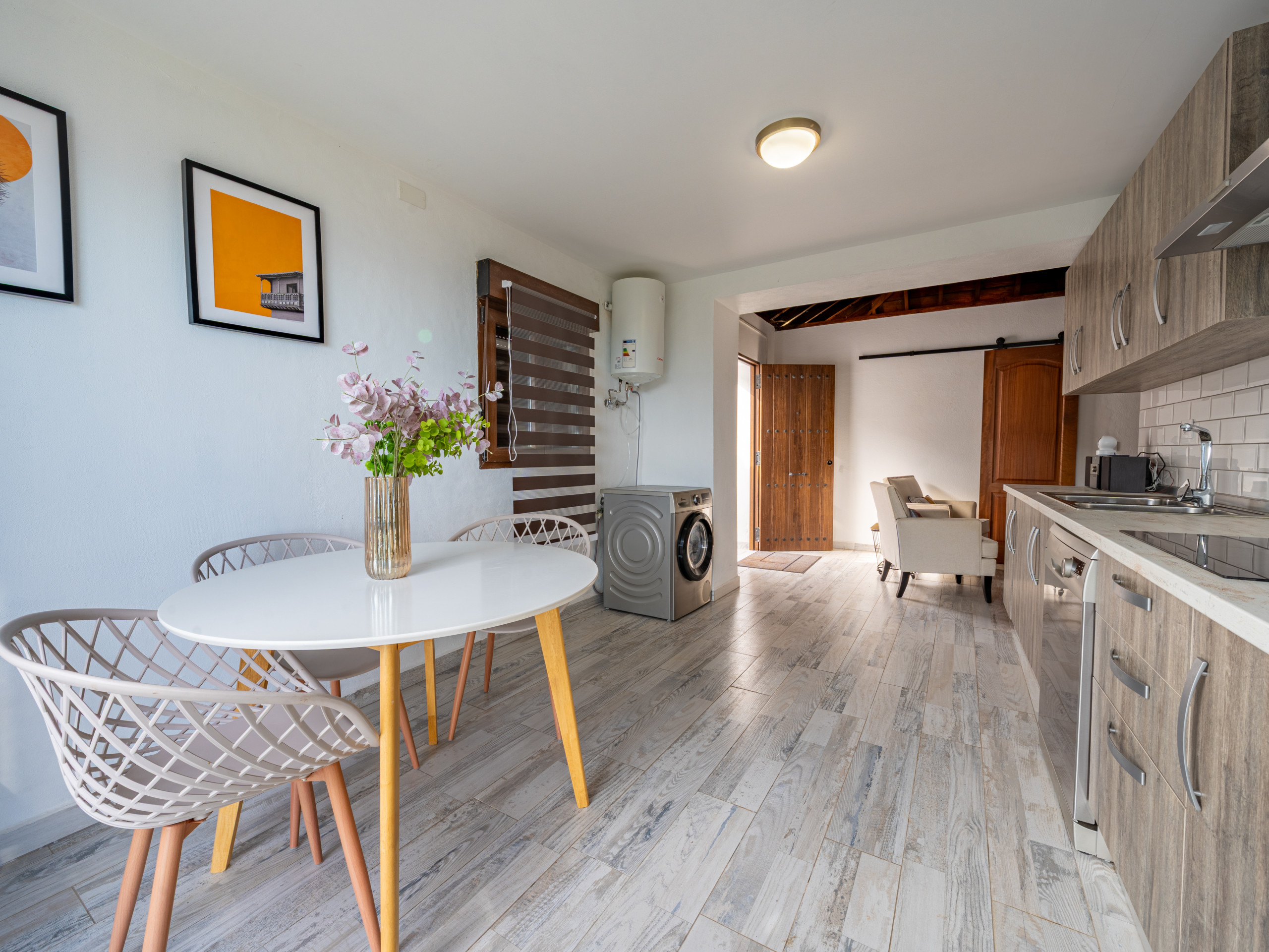 La cocina está completamente equipada con electrodomésticos modernos como nevera, lavadora, lavavajillas, microondas, máquina de café y menaje.